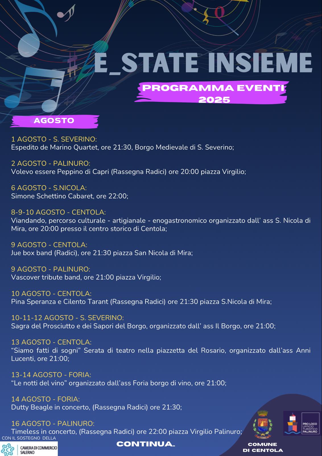 L’Amministrazione Comunale di Centola è lieta di presentare E_STATE INSIEME 2025, il programma degli eventi che animerà l’estate nel nostro territorio, tra cultura, spettacolo, musica e tradizioni popolari.