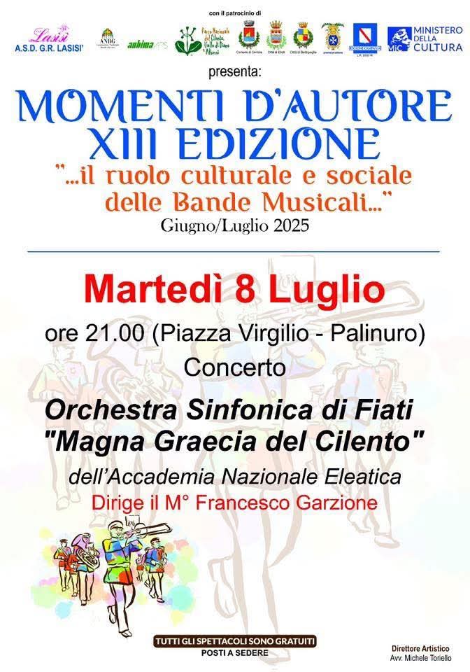 Protagonista della serata sarà l’Orchestra Sinfonica di Fiati “Magna Graecia del Cilento” dell’Accademia Nazionale Eleatica, diretta dal Maestro Francesco Garzione, con un repertorio pensato per valorizzare il ruolo delle bande musicali nella storia culturale italiana.