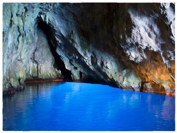 Partendo dal porto alla volta dell'escursione, si incontra quasi subito la Grotta Azzurra, che è la cavità più estesa e più nota di tutto il complesso di grotte ospitate da Capo Palinuro. La grotta si apre sul fianco settentrionale di Punta della Quaglia, con una entrata triangolare alta 6 metri e larga 10. Essa deve il suo nome e il suo fascino allo spettacolare effetto prodotto dall'azzurro che, provenendo apparentemente dal fondale marino, illumina l'intero ambiente rendendolo irreale e suggestivo. In realtà, questo particolare effetto accade per merito della luce del sole proveniente da un sifone subacqueo che dal fondo della grotta sbuca sul lato opposto di punta della Quaglia. La grotta Azzurra si caratterizza inoltre per la presenza di sorgenti idrotermali di tipo sulfureo; sono inoltre presenti numerose stalattiti e stalagmiti calcaree. Particolarmente suggestiva, entrando sul lato sinistro della grotta, la singolare formazione calcarea che "sbuca" dall'acqua e che ricorda la testa di un delfino.